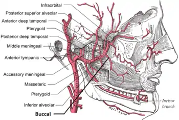 ![]() Esquema de las ramas de la arteria maxilar. La arteria bucal (o del buccinador) es la última por la derecha y por abajo del segundo tramo. | ||