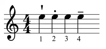 Hay tres articulaciones que afectan a la duración de una nota musical o acorde. Son el staccatissimo, el staccato y el tenuto.[11] En la siguiente figura se muestran estos signos de articulación junto con una nota que no lleva signo alguno ordenados de menor a mayor duración. De tal manera que el staccatissimo es el valor más corto, le sigue el staccato, a continuación aparece la nota sin articulaciones y el tenuto. Estas dos últimas indicaciones también pueden representar duraciones idénticas.[6][8]