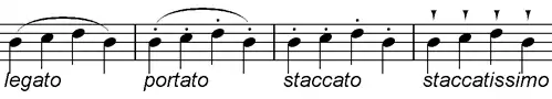 ![]() | Staccato | Stacc. | Destacar el sonido (con una pequeña interrupción del sonido).[6] |
