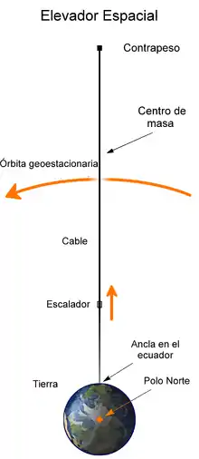 Básicamente es una estación espacial en una órbita geosíncrona, y de la que parte un cable de 35.786 km de largo que llega hasta el suelo, y que puede tener forma de riel. Para mantener el equilibrio de la estructura, además de situar el anclaje en algún punto lo más cerca posible del ecuador, para minimizar los efectos de tensión por la diferencia entre la rotación de la Tierra y la órbita geosincrónica del satélite, los ponentes de esta tecnología futurista proponen utilizar un tramo de cable idéntico extendido hacia el espacio o bien un contrapeso, de tal suerte que el cable estaría en equilibrio con su centro de masas en órbita geosíncrona. Una vez el cable en su lugar, pueden subir y bajar por él naves y cargas a un coste unas cien veces menor que el que supone lanzarlas por medio de un cohete[1] (prácticamente, el coste de la electricidad necesaria para impulsar el ascensor, que puede ser electricidad renovable procedente de placas solares situadas en el contrapeso).