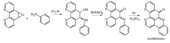 Moody y colaboradores sintetizaron la ascididemina a partir de anilina y 5,6-epoxi-5,6-dihidro-1,10-fenantrolina de acuerdo al siguiente esquema sintético:[3]