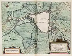 Llegando desde Grave, Federico Enrique de Orange-Nassau plantó sitio a la ciudad en abril de 1629 con un ejército de 24 000 soldados de infantería y 4000 de caballería, junto con 4000 campesinos. Mandó desviar los dos ríos principales (el Dommel y el Aa) que afluían al pantano, y construyó un dique de cuarenta kilómetros de longitud en forma de un gigantesco cuadrado que encerraba la fortaleza. Una vez creado este pólder, desecó el interior con molinos movidos por caballos. Cuando el suelo estuvo lo suficientemente seco extendió trincheras hacia los muros de la ciudad. Esta obra de ingeniería militar sería muy admirada por sus contemporáneos.