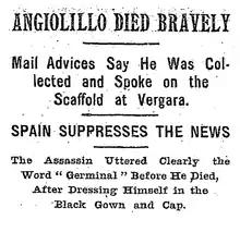 A principios de agosto de 1897 Angiolillo se encontraba en Guipúzcoa y el día 8 al mediodía le disparó tres tiros de revólver al presidente del gobierno Antonio Cánovas del Castillo cuando leía los periódicos en un banco del balneario de Santa Águeda, en Mondragón, en el que pasaba unos días de descanso. El asesino fue detenido y juzgado inmediatamente. Durante el juicio justificó su crimen como una represalia por las torturas a las que habían sido sometidos los sospechosos por el atentado de la procesión del Corpus de Barcelona en el castillo de Montjuic a donde habían sido conducidos, y de las que hacía responsable al presidente del gobierno. También declaró su solidaridad con los que vivían en la miseria, su rechazo a la injusticia social y su amor al anarquismo. Dijo también que había actuado solo, aunque existen dudas de que esto fuera verdad porque había comentado sus planes con varias personas, a pesar de que también lo negó durante el juicio. Fue condenado a muerte y la sentencia se cumplió mediante garrote vil el 19 de agosto de 1897, sólo once días después de haber cometido el asesinato.[4] La ejecución la llevó a cabo el burgalés Gregorio Mayoral Sendino.