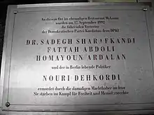 El 17 de septiembre de 1992, Sadegh Sharafkandi, Fattah Abdoli, Homayoun Ardalan y Nouri Dehkordi, los tres primeros líderes del PDKI y el último un traductor contratado, fueron asesinados en el restaurante Myconos, en Berlín.[49] por agentes iraníes residentes en Berlín y por otros que habían viajado especialmente para la operación.