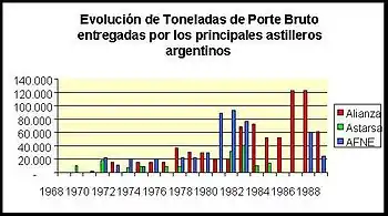 Un viejo amigo de ambos emprendedores confía en el proyecto aporta las garantías suficientes para obtener un crédito del Fondo de Marina Mercante por $3,5 millones.[2] Las obras se inician en 1968. El astillero crece mientras al mismo tiempo se construyen pesqueros y remolcadores. En 1969 se obtiene un préstamo del Fondo Nacional de Marina Mercante por $36,7 millones,[3] con el que se completaron las obras del nuevo astillero en febrero de 1971. El astillero se convierte en una fábrica de buques, con modelos estándar de la serie Freedom. En 1974 presentan un proyecto de ampliación en un nuevo astillero a construirse en Puerto Madryn. La industria naval mundial enfrentará una crisis en 1974 cuando el precio del crudo se cuadriplicó (de US$ 2,5 en octubre de 1973 a US$ 11,5 en febrero de 1974).[4]