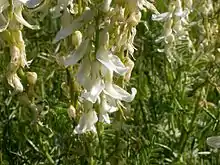 Son plantas herbáceas perennes, caracterizadas por tener tallos gruesos, peludos, así como follaje peludo. La planta tiende a tener varios grandes tallos divergente cerca de la tierra. La planta suele ser de 40 a 70 cm de altura. Se caracteriza por hojas oblongas de 6 a 14 cm de longitud, que son muy peludas en su lado envés. Las plantas a menudo tienen flores largas de 18 a 25 mm de estructuras alargadas blancas. Las flores se encuentran por lo general en la parte superior de la planta, por encima de la mayoría de las hojas. La quilla del flor puede ser a veces de color púrpura. Los sépalos son muy pequeñas estructuras peludas unos 8 mm de largo. La planta florece en junio y julio. La planta se caracteriza por la producción de vainas caídas sin pelos de más o menos 4 cm de largo. Costura de la vaina es lo suficientemente gruesa que casi forma una partición entre las semillas.[1]