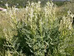 Astragalus: nombre genérico derivado del griego clásico άστράγαλος y luego del Latín astrăgălus aplicado ya en la antigüedad, entre otras cosas, a algunas plantas de la familia Fabaceae, debido a la forma cúbica de sus semillas parecidas a un hueso del pie.[4]