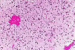 Las muestras de biopsia del tumor por lo general muestran una elevada densidad celular, atipias, mitosis y una significativa actividad proliferativa.[3] El origen astrocitario del tumor puede ser determinado mediante la detección de la GFAP con métodos inmunohistoquímicos. En más de la mitad de los tumores pueden detectarse mutaciones de la proteína Tp53 y de la isocitrato deshidrogenasa (IDH).[1]