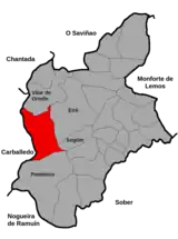Limita con las parroquias de Vilar de Ortelle al norte, Eiré y Següín al este, Pombeiro al sur y con las parroquias de A Cova y Chouzán al oeste, estas dos últimas en el municipio de Carballedo.
