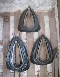- horcate: compuesto, generalmente de dos varillas metálicas encorvadas, que abrazan el collerón en la unión de las dos partes citadas. Le proporcionan la rigidez necesaria para soportar sin deformarse, el esfuerzo de tracción. El horcate se cierra por abajo con un latiguillo de cuero o con una cadena y un gancho.; lo cual permite ajustar el collerón al cuello del animal, y por arriba con un trancalete de cuero y su hebilla. Hacia su parte superior lleva unas anillas por donde pasan las riendas , y hacia la inferior dos orejetas para sujetar los ganchos de los tirantes.