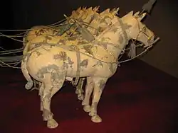 - se compone de cuatro caballos o más, generalmente, se disponen por parejas, una en la lanza (tronco) y las demás delante de esta. La pareja delantera se denomina guías, y las intermedias entre esta y el tronco, cuartas; numerándose de este modo cuando son varias: primeras, segundas, etc. Se distingue el atalaje de todas ellas, llamado de guías, del que lleva la pareja de tronco; este, a su vez, varía, según que el carruaje sea de lanza suspendida o no.