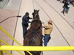 - de una brida con serreta y riendas de cuero que se prolongan mediante una cuerda de longitud suficiente para poder guiar el vehículo desde su interior.