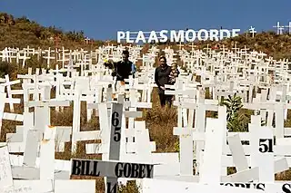 ![]() El Witkruismonument («Monumento de las cruces blancas») fuera de Polokwane, una serie de cruces erigidas en memoria de granjeros sudafricanos asesinados. | ||