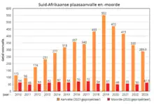 El término «ataques a granjeros sudafricanos» (en afrikáans: plaasaanvalle) se refiere a la afirmación de que los granjeros sudafricanos blancos son asesinados a una tasa mayor que la tasa de homicidios en la población general de Sudáfrica.[1][2][3][4] Afirmaciones muy controvertidas sobre que tales ataques a granjeros se dirigen desproporcionadamente hacia personas blancas son un elemento clave de la teoría de la conspiración del genocidio blanco y se han convertido en un tema de conversación común entre nacionalistas blancos en todo el mundo.[5][6][7][8][9][10] No hay cifras confiables que sugieran que los granjeros blancos sean el objetivo en particular o que corran un riesgo desproporcionado de ser asesinados.[1][6][10][11][12][13][14] El Congreso Nacional Africano y otros analistas sostienen que los ataques a granjas son parte de un problema de delincuencia más amplio en Sudáfrica y no tienen una motivación racial.[2][6][15][16]