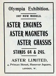 Un Aster de 12 hp se exhibió en el Salón del Automóvil del Crystal Palace de 1903, que sirvió para presentar la gama de automóviles Aster que se venderían en Gran Bretaña entre 1905 y 1907.