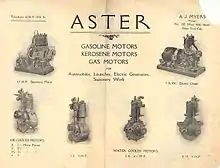 Aster produjo una amplia gama de motores, incluyendo motores estacionarios; generadores de electricidad; motores de automóviles, motores de servicio pesado, motores marinos para lanchas y motores aeronáuticos. Había opciones refrigeradas por aire y por agua, además de motores de gasolina, motores de queroseno y motores de gasolina.
