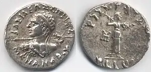 Verso: Leyenda en alfabeto griego: ΒΑΣΙΛΕΩΣ ΣΩΤΗΡΟΣ ΜΕΝΑΝΔΡΟΥ (Basileos Soteru Menandru), "De Menandro el rey salvador".