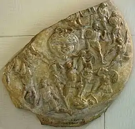 El escudo, con un diámetro de 4,8 a 5 m, estaba decorado en el exterior con una amazonomaquia.[38] Era el elemento decorativo más visible y por tanto el más descrito y el más copiado. En el centro había nuevamente un gorgoneon que debió parecerse a la Medusa Rondanini ya que está fuertemente inspirado en ella. Estaba rodeado por una treintena de combatientes. Teseo comandaba las tropas griegas, por lo tanto, los atenienses. Frente a ellas, las amazonas estaban montando un ataque a la Acrópolis como lo indica el paisaje abrupto. Según Plutarco[39], Fidias se habría representado entre los atenienses, en el centro arriba, como un viejo calvo preparándose para arrojar la piedra sostenida con ambas manos sobre su cabeza. También habría incluido a Pericles, justo a su lado, a la derecha, armado con una lanza[38]. Este gesto, por el que fue criticado, es sin embargo la prueba de que esta decoración esculpida en relieve fue efectivamente obra del propio Fidias.[40][41][37] El interior del escudo, menos visible, estaba pintado con una gigantomaquia.[4][42] Las tres batallas representadas en la estatua (centauromaquia, gigantomaquia y amazonomaquia) también se encontraron en la decoración esculpida del Partenón. Las metopas del sur están decoradas con una centauromaquia, las del este con una gigantomaquia y las del oeste con una amazonomaquia.[43][44]