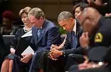 El presidente de los Estados Unidos Barack Obama llamó a los disparos un «vicioso, calculado, despreciable ataque» y una «tremenda tragedia».[90] También hizo llamadas inmediatas para el control de armas.[91] La Orden Fraternal de la Policía, el mayor sindicato de policía en los Estados Unidos, llamó por el tiroteo a ser investigado como un delito de odio[3][92][93] y criticó la respuesta del presidente Obama, diciendo que necesitaba hablar en nombre de todos y no dar un discurso para los oficiales de policía y otro discurso para los afroamericanos.[92]
