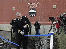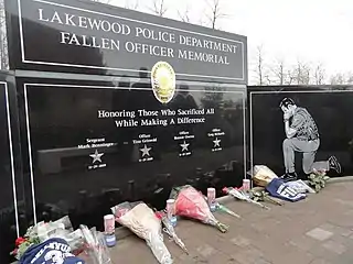 ![]() El memorial a los oficiales caídos del Departamento de Policía de Lakewood, que rinde homenaje a las víctimas del tiroteo. | ||