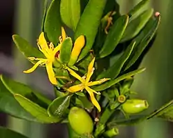 Son arbustos erectos que alcanzan los 1-2 m de altura, son parasitarios de las raíces de otras plantas. Tiene las hojas lanceoladasde 2-5 cm de largo, 6-14 mm de ancho y el ápice obtuso, atenuada la base; con un peciolo de 2 mm de largo . La inflorescencia, más corta que las hojas, se produce en forma de racimos con 8-10 flores; los pedicelos son muy cortos. Las flores están dulcemente perfumadas y tienen seis pétalos de color amarillo. El fruto es ovoide- oblongo de 15 mm de largo y de color escarlata.