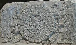 El símbolo de atl-tlachinolli brota de las bocas de Huitzilopochtli y de Moctezuma Xocoyotzin en el Teocalli de la Guerra Sagrada.