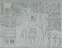 Este texto continúa diciendo que Akenatón hizo una gran ofrenda al dios Atón "y este es el tema [de la ocasión] que se ilustra en las estelas donde se encuentra con su reina y su hija mayor ante un altar colmado con ofrendas debajo de Atón, mientras brilla con sus rayos".[95]