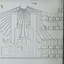 Los templos en Amarna no siguieron el diseño tradicional egipcio. Eran más pequeños, con santuarios abiertos al sol, que contenían grandes cantidades de altares. No tenían puertas cerradas.[81][82]