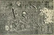 La religión atonista se basa en textos e inscripciones, creados a partir del inicio del reinado de Amenofis IV.[111] El culto obtuvo grandes cantidades de adeptos de la corte, nobles y militares, quienes estaban hartos de las intromisiones del clero. El atonismo se extendió por todo el Imperio Nuevo, a pesar de la oposición de los sacerdotes de Amón, aunque muchos de los ciudadanos que se convirtieron a la religión, no creían realmente y seguían con el culto a los dioses antiguos en secreto.[112] En el quinto año del reinado de Amenofis (ahora Akenatón) se había empezado la construcción de una nueva capital y para el año séptimo la capital del país ya había sido trasladada a Ajetatón en la actual Amarna, quedando fuera de la influencia de los sacerdotes y trasladando a la corte, militares y ciudadanos hacia la nueva ciudad.[113][114]