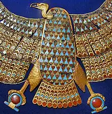 El buitre (figuración de la diosa Nejbet, titular del Alto Egipto; los despojos del buitre son atributos de las madres de reyes), la doua-our ( [dw3-wr], barba postiza reservada al faraón y a los dioses antropomorfos, curvada en el caso de los dioses, derecha en el del faraón, que se lleva en el mentón y se ata tras las orejas),[2] el rabo de toro (trofeo que se lleva a la cintura del faraón, y que le dota de la potencia del animal sagrado), cruz o cetro heka (con el extremo superior curvado con la forma de un cayado de pastor, haciendo del faraón pastor de su pueblo), el flagelo nékhekh (es el mayal de Osiris, junto con la cruz heka, es insignia de autoridad -heka y nekhakha-[3]), el collar o pectoral menat ( [mnj.t], es un pesado collar de perlas metálicas que se abrocha en la espalda y se retiene por un contrapeso, se vincula a la diosa Hathor, producía un ligero ruido por el entrechocar de sus perlas, que recordaba el sonido que la diosa hacía al atravesar las masas de papiro; se ofrecía al soberano por la diosa o por su esposa como signo de protección y garantía de su renacimiento), además del par de cetros heka y nekhekh, llevados por el dios Osiris-Andjety, había un tercer cetro, el ouas[4] ( [w3s], que generalmente se atribuye a los dioses; en origen se trataba de un bastón con la extremidad inferior bifurcada, usado para capturar las serpientes y extraerles el veneno, se conocía desde la época arcaica, y se adornaba en su extremidad superior con la cabeza de Seth en forma de un cánido estilizado, simboliza el poder divino que se transmite al faraón), la cabeza de maza (en las primeras dinastías, símbolo del poder supremo); todas las insignias de dominio podían combinarse de diferentes maneras, mostrando que los soberanos eran seres excepcionales.[5]