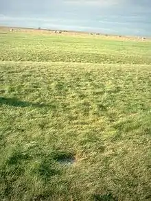 Un disco blanco marca la ubicación del agujero Aubrey número 21 en el lado occidental de la entrada sur de Stonehenge. Detrás se ve el banco y el foso que rodean el monumento.