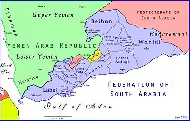 Ubicación de Audhali dentro de la Federación de Arabia del Sur (en amarillo)