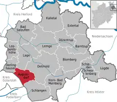 Se encuentra ubicado al este del estado, en la región de Detmold, en el bosque Teutónico, a poca distancia al sur de la orilla del río Weser y de la frontera con el estado de Baja Sajonia.
