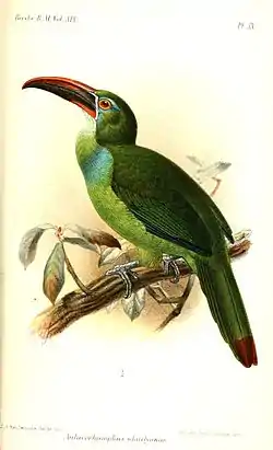 El tucanete de tepuy (Aulacorhynchus whitelianus) es una especie de ave piciforme perteneciente a la familia de los tucanes que vive en Sudamérica No se conocen subespecies.