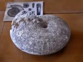 ![]() Concha fósil de Aulacostephanus yo de Francia , en exhibición en la Galerie de paléontologie et d'anatomie comparée en París | ||