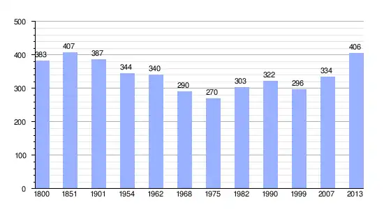 Los datos demográficos contemplados en este gráfico de la comuna de Aulhat-Saint-Privat[4] se han cogido de 1800 a 1999 de la página francesa EHESS/Cassini, y los demás datos de la página del INSEE.[5]