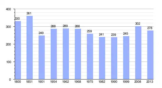Los datos demográficos contemplados en este gráfico de la comuna de Auquemesnil[4] se han cogido de 1800 a 1999 de la página francesa EHESS/Cassini, y los demás datos de la página del INSEE.[5]
