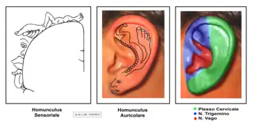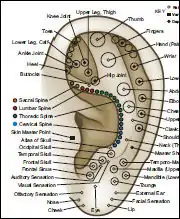 El francés Dr. Paul Nogier entre 1954 y 1956 creó una cartografía detallada del pabellón auricular.[19] Esta se basa en la idea de que el pabellón auricular es una representación completa del resto del cuerpo.[18] De esta forma, en la oreja se reflejaría una imagen parecida a la de un feto in utero. El feto está orientado cabeza abajo, a nivel de su lóbulo.[20] Esta forma funciona en la teoría de la Medicina china como el “espejo” de todo el cuerpo.[21]