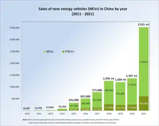 - China Association of Automobile Manufacturers (CAAM) (12 de enero de 2022). «Sales of New Energy Vehicles in December 2021». CAAM. Consultado el 13 de enero de 2022. NEV sales in China totaled 3.521 million in 2021 (all classes), consisting of 3.334 million passenger cars and 186,000 commercial vehicles.