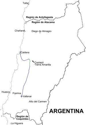 228,6 km total[1] 188,0 km de la ruta 5 33,8 km del by-pass Copiapó 6,0 km de acceso Bahía Inglesa 0,8 km de la ruta C-46 | |
