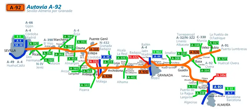 SE-30 Avenida de Andalucía (Sevilla) A-8028 Polígono Industrial Merka A-8026 Polígono Industrial El Chaparral E-5 SE-40 Polígono Industrial Alcalá X A-8033 Polígono Cabeza Hermosa A-398 SE-3203 A-360 (Alcalá de Guadaíra) SE-3202 A-8100 (Carmona) A-394 SE-4200 SE-5204 A-8125 (Arahal) SE-5201 A-364 A-361 (Paradas) A-380 SE-7203 SE-7205 SE-7201 (La Puebla de Cazalla) SE-8203 A-351 A-451 A-378 SE-9219 (Osuna) SE-9205 A-8326 (Aguadulce) SE-9214 SE-9209 SE-9210 A-318 A-353 (Estepa) SE-9215 SE-9208 A-379 (Lora de Estepa) A-365 (La Roda de Andalucía) MA-6408 (Fuente de Piedra) A-7280 (Mollina) A-384 A-343 N-331 A-7281 A-45 (Llanos de Antequera) A-7282 (Huertas del Río) A-7200 MA-5101 A-7201 (Archidona) A-333 A-7200 A-92M (Estación de Salinas) A-4107 (Cuesta Blanca) A-341 A-4156 A-328 A-4154 (Loja) A-4155 (Salar) GR-4400 (Venta Nueva) GR-4401 (Villanueva Mesía) A-335 A-402 (Loreto) GR-3400 (Láchar) GR-3402 (Cijuela) A-4075 GR-3403 (El Jau) A-92G (Santa Fe) GR-43 (Torrehueca-Torreabeca) N-432 (Atarfe) E-902 A-44 GR-30 (Albolote) GR-3424 (Los Olivos) GR-3103 (Alfacar) GR-3102 (Víznar) A-4002 A-4003 (Huétor Santillán) A-4004 (El Molinillo) A-4005 (Diezma) A-308 A-4105 (Lopera) A-4100 (Purullena) A-92R1 A-325 A-325R1 A-92N (Guadix) A-4101 A-4102 (Alcudia de Guadix) GR-6103 A-337 (La Calahorra) GR-6104 A-4103 (Huéneja) A-1176 (Fiñana) A-1176 A-92R2 (Abrucena) A-92R2 A-1177 (Abla) A-1177 (Doña María) AL-4403 A-1075 (Nacimiento) AL-4404 AL-3410 (Estación de Gérgal) AL-4405 A-1178 (Gérgal) N-340a (Tabernas) N-340a AL-3412 (Rioja) AL-3100 (Pechina) E-15 A-7 A-1000 (Viator) | ||||||||