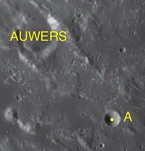 Auwers es un pequeño cráter de impacto lunar que se encuentra en la cordillera Montes Haemus, en el borde sur del Mare Serenitatis. Se halla al sureste del cráter Menelaus.