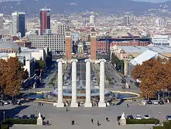 Al final de la avenida y al pie de la montaña se construyó la famosa fuente Mágica de Montjuïc, obra de Carles Buïgas, que asombró al público por su fantástico juego de luces y surtidores de agua; aún hoy es una obra emblemática de la capital catalana, donde suelen celebrarse espectáculos piromusicales en las fiestas de la Merced y todos los fines de semana del año se ponen en marcha en un recital de agua, luz, color y música (añadida a finales de los años 1980). Desde el año 2013 se hacen las campanadas de fin de año retransmitiendo en TV3 por toda Cataluña.[9]Como preludio a la gran fuente se colocó una pequeña cascada en la escalinata de acceso desde la avenida a la plaza de Carles Buïgas, situada en tres niveles separados por tiestos en forma de copa.[10]
