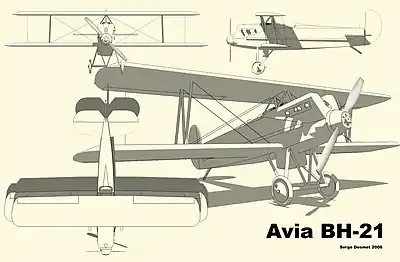 - diseño del caza BH-21 con alas recortadas para darle mayor velocidad; su primer vuelo tuvo lugar a principios de 1925; estaba propulsado por un motor Hispano-Suiza 8Fb potenciado que desarrollaba 400 hp, y una hélice especialmente diseñada por Reed-Levavasseur; la superficie alar quedó reducida en 8,20 m²; pilotado por el piloto de la compañía K. Fritsch; el Avia BH-21R ganó la carrera aérea nacional celebrada en septiembre de 1925, recorriendo los 200 km a una velocidad media de 300,59 km/h.