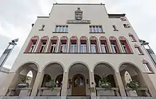 En la fachada este se encuentra adosado el escudo municipal tallado en piedra y realizado en 1983. Un escudo de armas creado en 1932 y donado por el príncipe fue trasladado desde la antigua ubicación a la fachada noroeste del ayuntamiento en la década de los años 1980.[4]