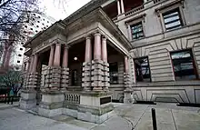 En el techo hay unas urnas ornamentales de 1,2 m, hechas de piedra caliza.[8] Durante la última remodelación se reemplazaron con material liviano para la seguridad de los peatones.[8] El edificio tiene dentellones donde el techo se encuentra con las paredes, y el cuarto piso tiene un balcón con columnas toscanas emparejadas en el lado occidental.[43] Además, el exterior cuenta con piedras angulares sobre las ventanas en el primer y segundo pisos, además de una balaustrada a lo largo de la línea del techo.[43] Dentro del edificio, las columnas del vestíbulo están cubiertas con un revestimiento de mármol falso llamado Scagliola.[4] El vestíbulo tiene pisos de mármol y boiserie de roble.[7] En el atrio, las paredes están cubiertas con un azulejo blanco que fue redescubierto durante la remodelación de 1996.[8]
