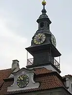 A su vez, el frontón de la fachada opuesta a la sinagoga Vieja-Nueva exhibe otro reloj con una esfera hebrea (los números representados por letras hebreas en orden invertida), cuyas manecillas corren en sentido opuesto al habitual, siguiendo la dirección en que se escribe en hebreo. Todos los relojes, incluido el del frontón, están conectados en el interior al mismo mecanismo y fueron diseñados y construidos por el relojero real de Praga, Sebastian Laudensberger, en 1764.[4]