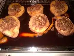 Una bandeja de "ayva tatlısı" recién saliendo del horno. Se ha utilizado vino tinto por el color y cáscaras de naranja por el aroma. Las porciones se van a servir con kaymak, ya que hay nueces dentro de los membrillos.