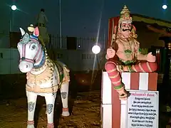 Los templos de Aiyanar suelen estar flanqueados de estatuas gigantescas y coloreadas que le representan, a él y sus compañeros, cabalgando a lomos de un caballo o de un elefante. Los santuarios se encuentran a las afueras de las poblaciones rurales, donde el dios es visto a lomos de un caballo con una espada, un tridente o una lanza para derrotar a los demonios.