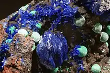 La azurita aparece a menudo asociada con la malaquita. Estos dos minerales tienen composiciones químicas muy similares: